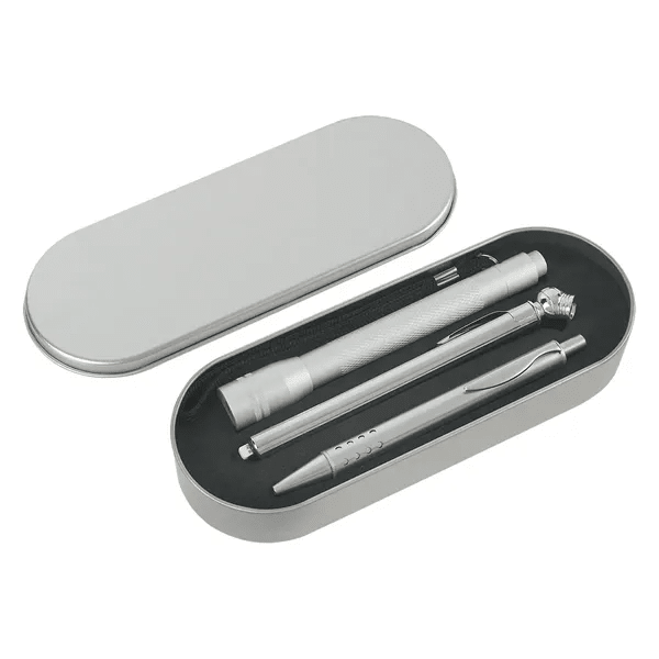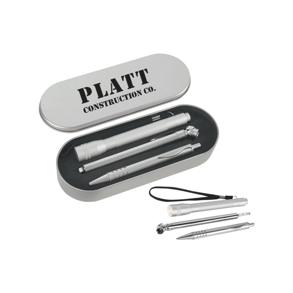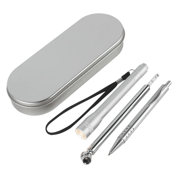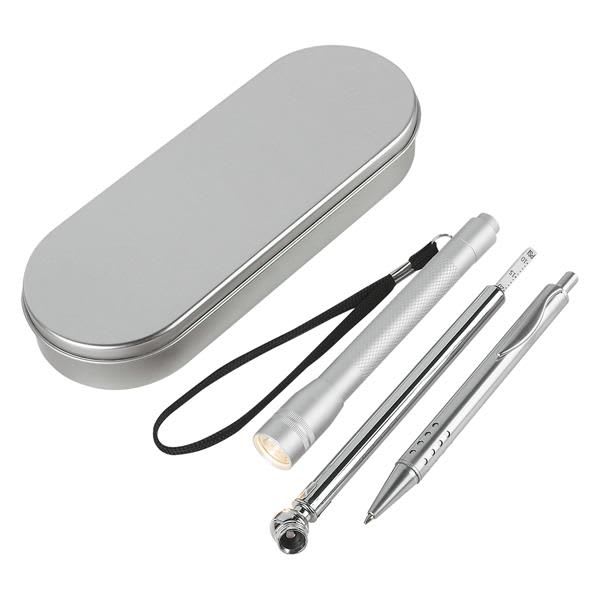 Tire Gauge, Max: 50 PSI. Ball Pen With Black Ink. Aluminum Twist Action Flashlight. Batteries Included.