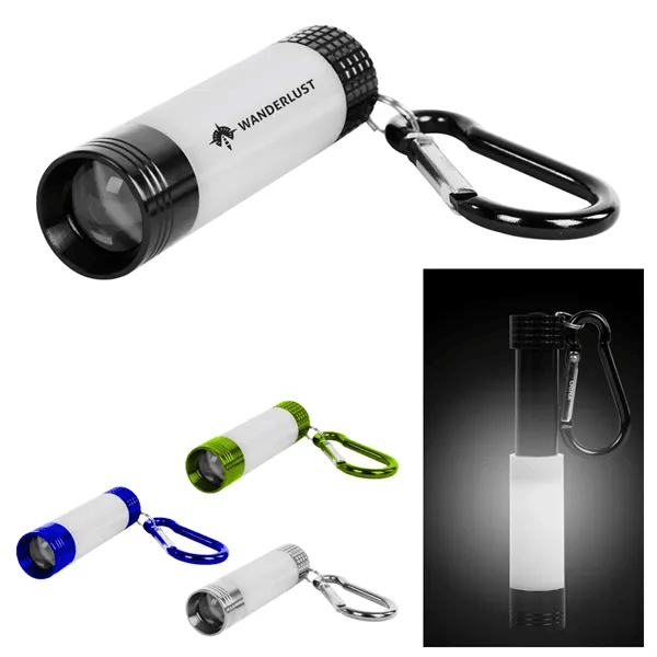 Extra Bright White LED Light. Flashlight Extends for Extra Lighting. Carabiner Attachment. Not For Climbing. Button Cell Batteries Included.
